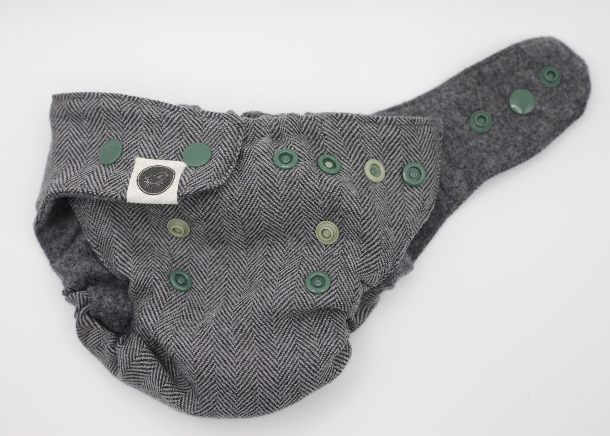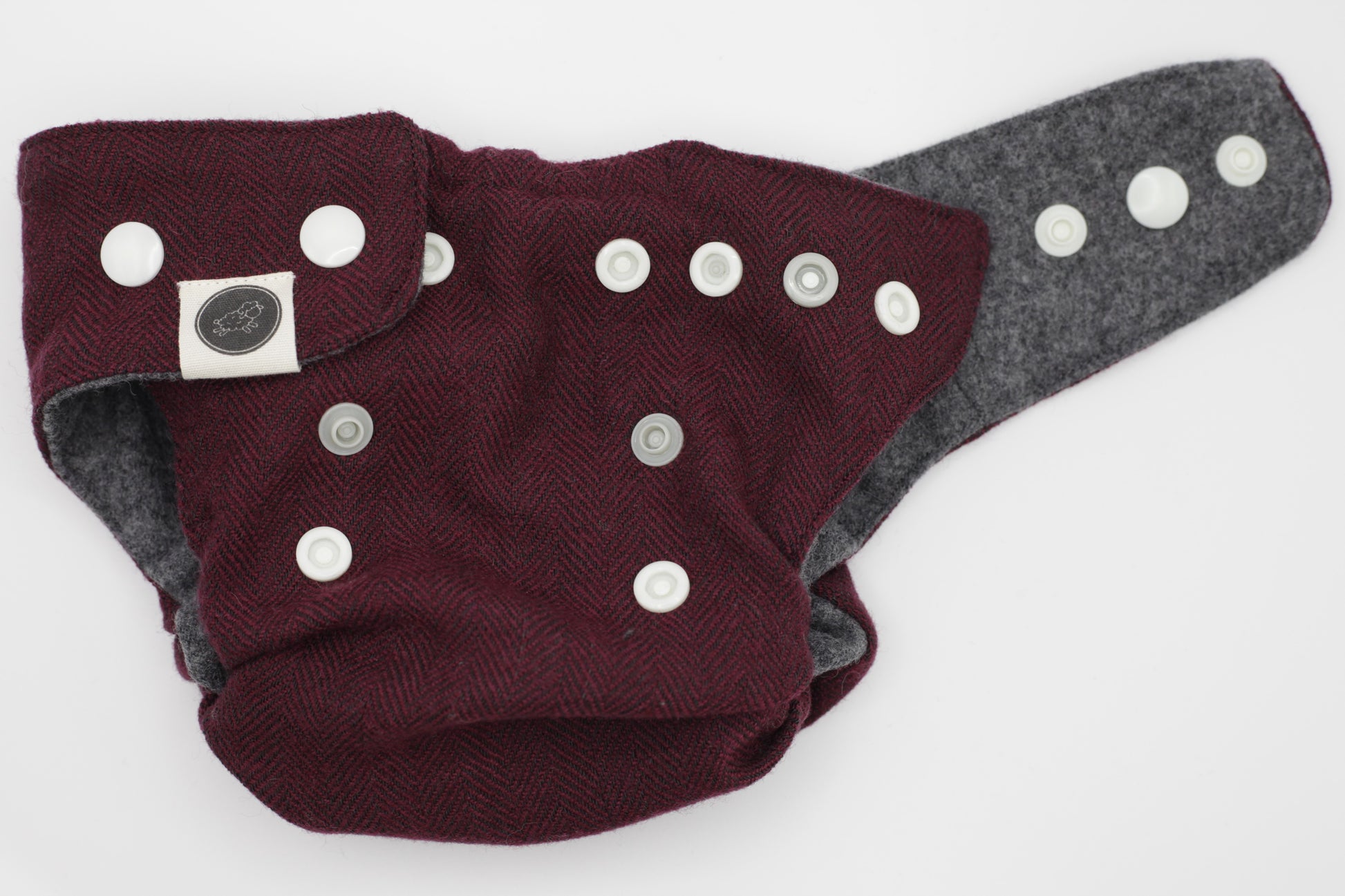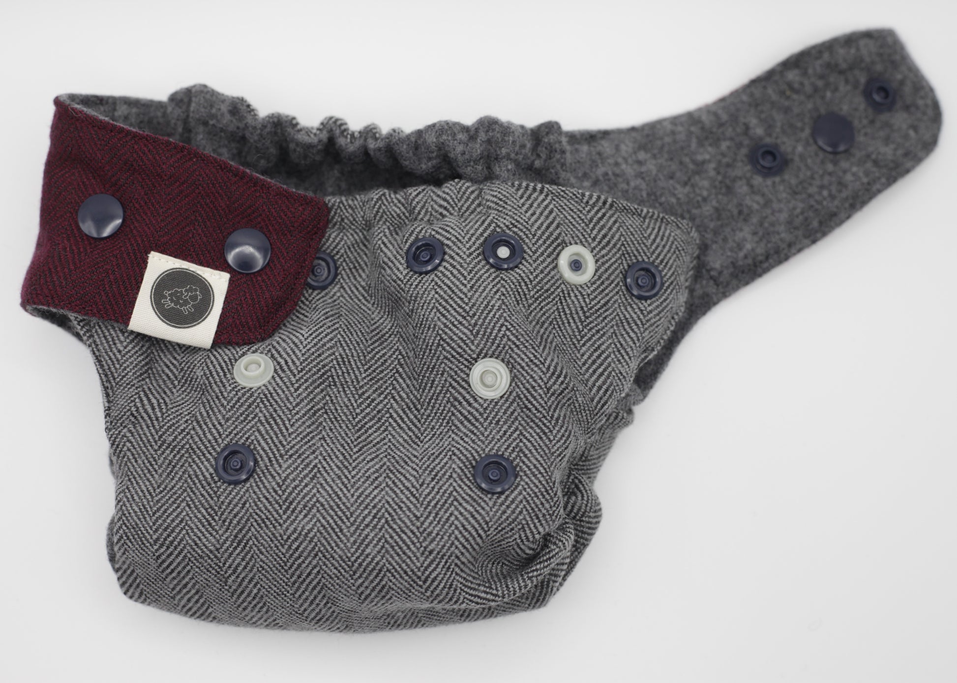 Der Außenstoff wurde in Österreich aus Wolle aus kontrolliert biologischer Tierhaltung, der graue Innenstoff aus mulesingfreier Wolle in Deutschland gewebt. Die Gummis sind biozertifiziert und bestehen aus Baumwolle und Naturkautschuk. Hergestellt wurde sie in Deutschland mit Poyestergarn, damit sie langlebiger und stabiler ist. Wollgarn ist leider nicht sehr stabil und Baumwolllgarn wäre eine Nässebrücke nach außen. Die farbcodierten Kam Snaps helfen beim Einstieg in das Wickeln mit Stoff. Durch den Übersnap passt die Windel auch zarten Neugeborenen.