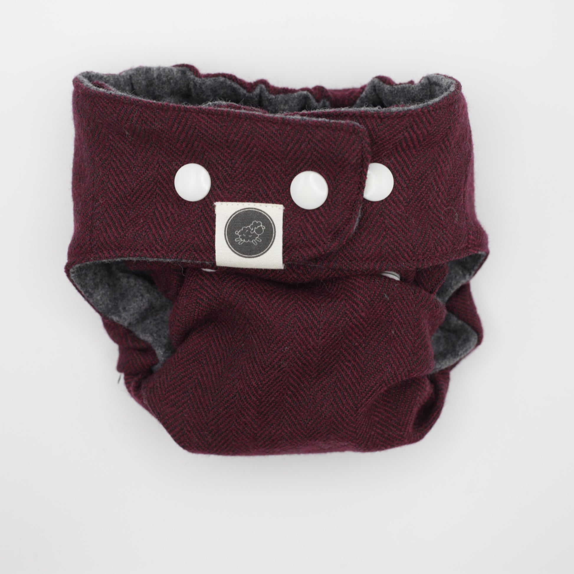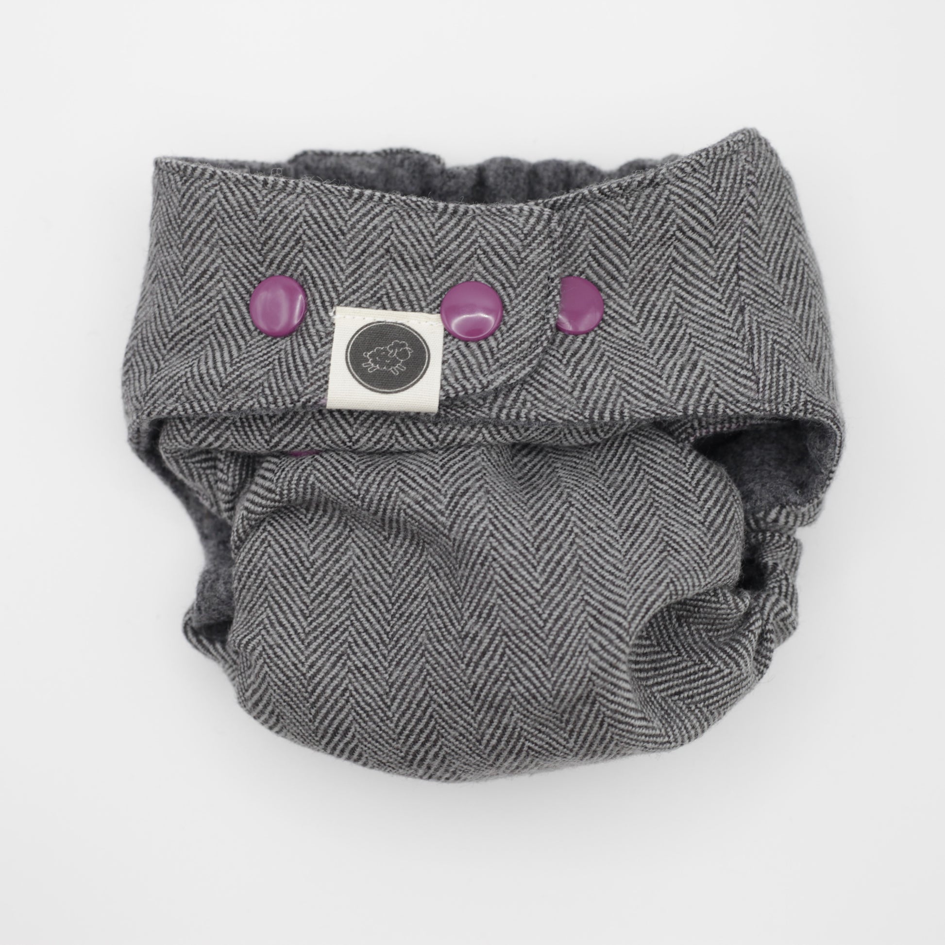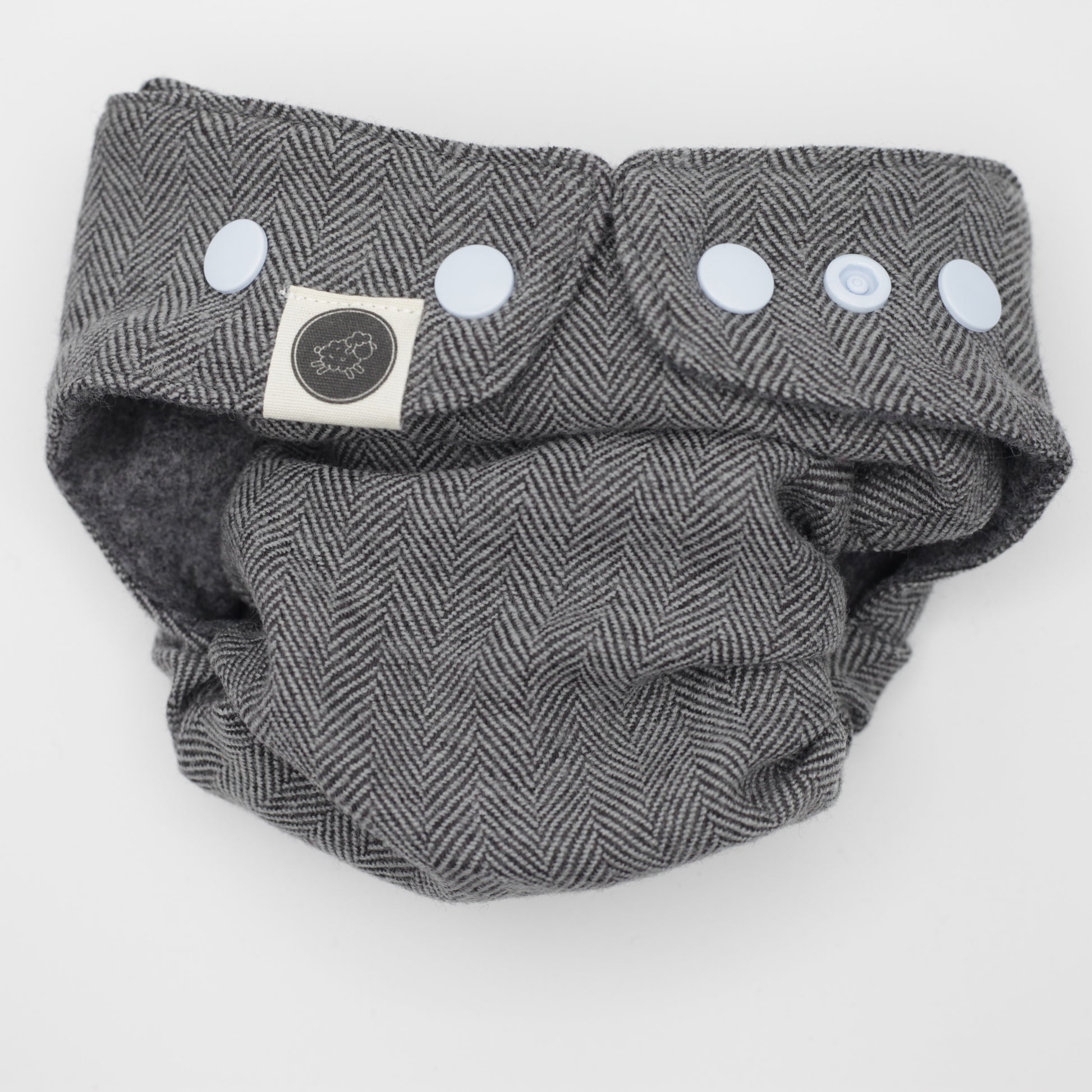 Der Außenstoff wurde in Österreich aus Wolle aus kontrolliert biologischer Tierhaltung, der graue Innenstoff aus mulesingfreier Wolle in Deutschland gewebt. Die Gummis sind biozertifiziert und bestehen aus Baumwolle und Naturkautschuk. Hergestellt wurde sie in Deutschland mit Poyestergarn, damit sie langlebiger und stabiler ist. Wollgarn ist leider nicht sehr stabil und Baumwolllgarn wäre eine Nässebrücke nach außen. Die farbcodierten Kam Snaps helfen beim Einstieg in das Wickeln mit Stoff. Durch den Übersnap passt die Windel auch zarten Neugeborenen.